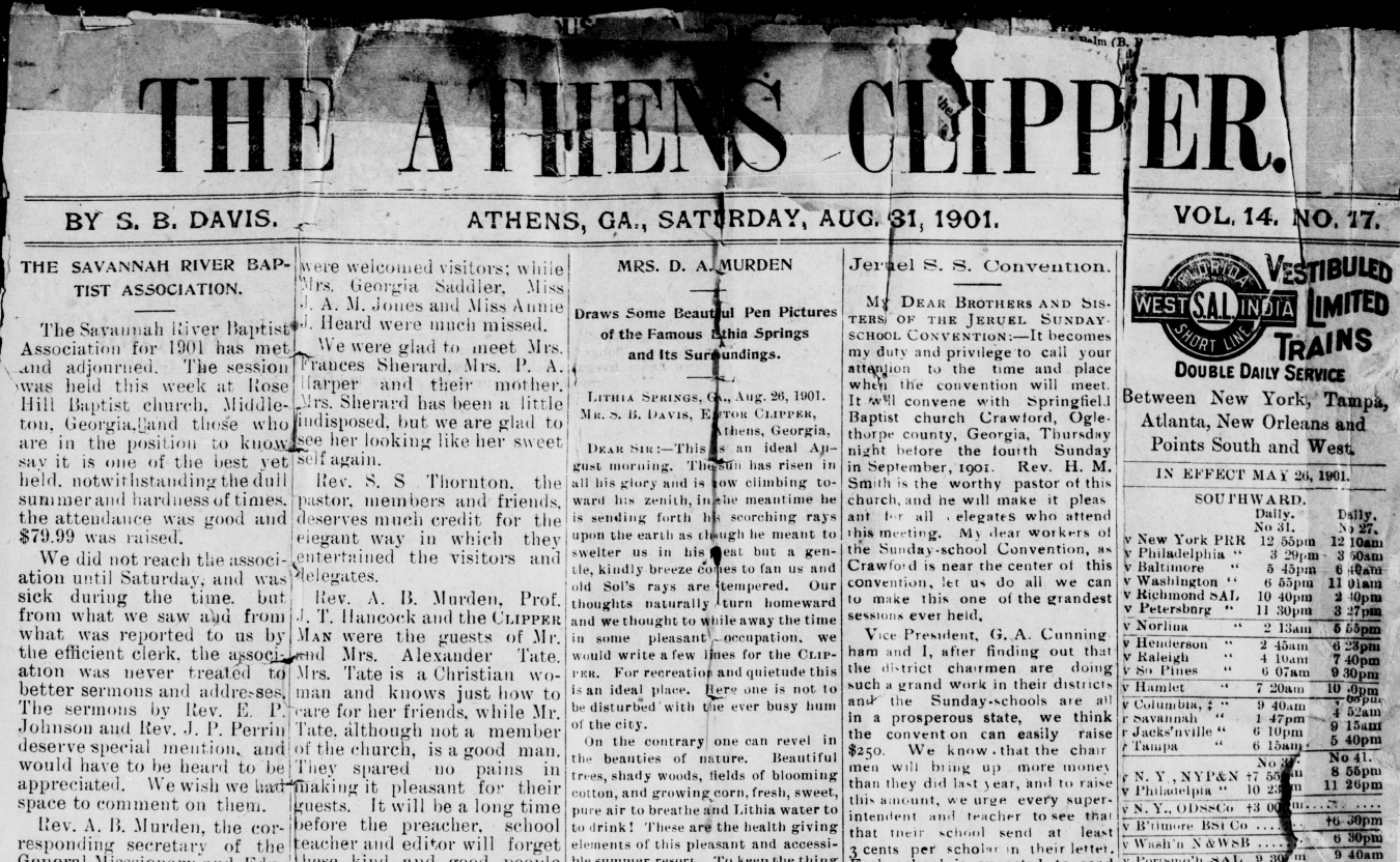 The Athens Clipper was another local Black-owned newspaper, established by Samuel B. Davis in 1888. It was in print from that time until about 1905. Though extant copies of the paper from 1901 show the office as being located at 203 Hull Street, it is said to have once been located at 116 E. Clayton Street. Sam Davis was the proprietor, editor and publisher, and the paper circulated from his office each Sunday, covering religious and local activity within the Black community. The paper was temporarily taken over by his wife, Minnie, a local educator, while he recovered from a gunshot wound in 1890. Following his death near the end of the century, Minnie took over once again before eventually selling to A.T. Jackson.