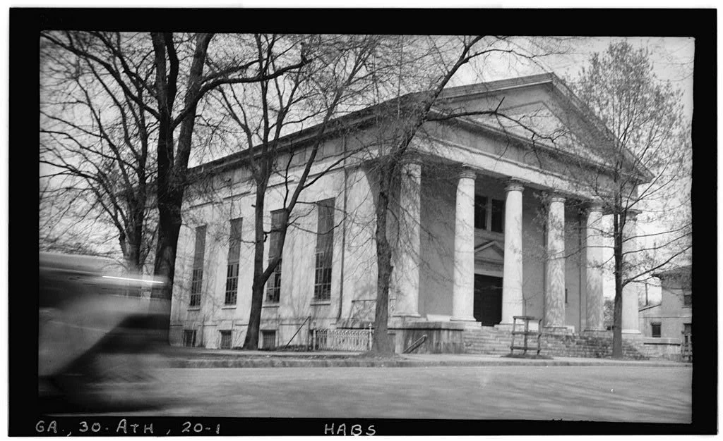 When James Tinsley built this Federal style home, he located it in Athens’ first residential neighborhood. The second oldest residence in Athens, this building has been used for a variety of purposes, including a boardinghouse, a funeral home, a library, and the District Attorney’s office. It is constructed of stuccoed brick and has a hip roof, massive interior chimneys, nine over nine windows and a belt course between the two stories. The interior has been greatly remodeled.