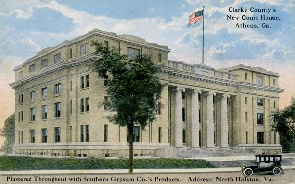 East Washington Street Situated on a lot in Lickskillet, one of Athens’ first residential neighborhoods, the Courthouse, which was the second to be constructed in Clarke County, was designed in the Beaux Arts Classicism style. Originally housing the county jail, the fourth floor windows were barred and a courtyard was located on the roof.