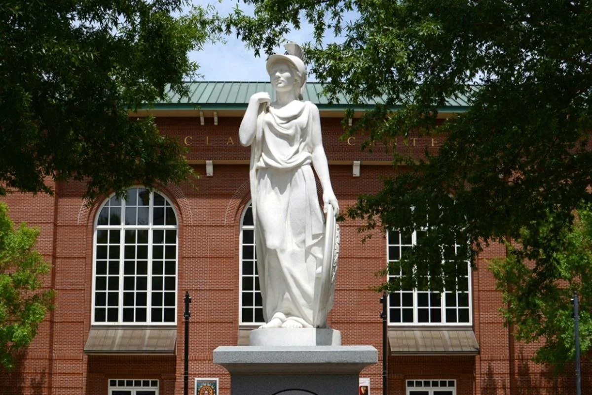 This statue was granted to Athens-Clarke County by local citizens to commemorate the 1996 Olympic games. According to Greek Mythology, Athena, the goddess of wisdom, served as a guardian to the ancient city of Athens. Athena stands nine feet tall and is carved from fine Italian marble. The inscription on her base reads, "Thus in all these ways, we will transmit the city, not only not less, but greater and more beautiful than it was transmitted to us." This statement is the last line of the Athenian oath taken by the youth of ancient Athens, and appropriately articulates the sentiments of Athens, Georgia residents today.