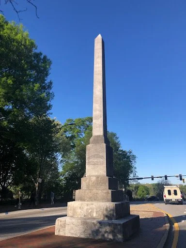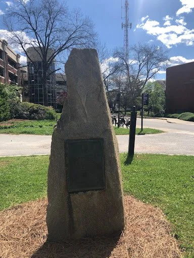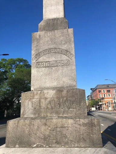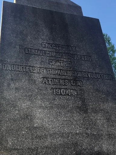 Erected in 1904 by the Daughters of the American Revolution, this monument is dedicated to Elijah Clarke. Born in 1742, Clarke grew up in North Carolina and served as a militia captain in the Revolutionary War, fighting both the British and Native Muscogee and Cherokee tribes. During the war, his victory at the Battle of Kettle Creek was met with great celebration and Clarke was awarded a plantation for his efforts. After the war for Independence was won, Clarke was involved in many political spheres and became a member of the Georgia Assembly from 1781 to 1790. Clarke also served as Commissioner for Native Americans. Despite his political title, Clarke was a major advocate for indigenous removal and was regarded as an “Indian Killer.” After the Jack’s Creek battle against the Muscogee people in 1787 which resulted in the death of roughly 25 native people, Athenian settlers revered Clarke once again, considering him the hero of the battle and adding to his notoriety in the town. Due to his popularity, Clarke County was named for him in 1801.
