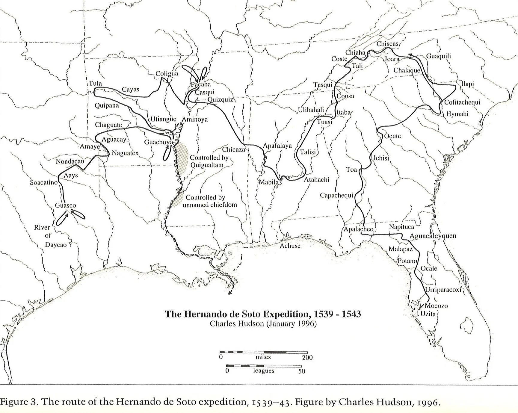 De Soto’s expedition through Georgia exiting east of the Oconee River valley was mapped by former UGA anthropologist Charles Hudson based on historical accounts and archaeological evidence. De Soto initially passed through the town of Capachequi in Southwest Georgia and continued northeast taking him through Toa on the Flint River, the major mound center of Ichisi, thought to be the present-day Ocmulgee mounds, Altamaha, (Milledgeville), Ocuutay, (Sparta), and Coofahquei (Greensboro), roughly 35 miles south of Athens.