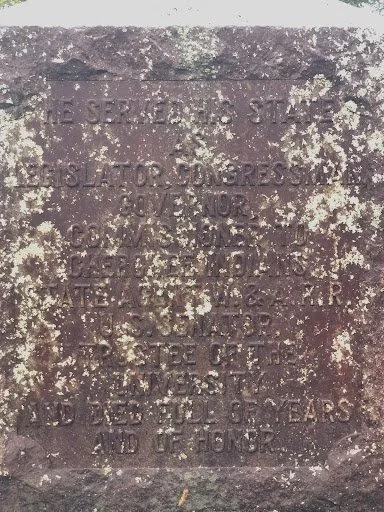 Similar to the positioning of his home, Lumpkin chose his burial spot at the highest point in the cemetery. His gravesite consists of two structures, an obelisk, and a funerary monument. Interestingly, the obelisk was built during Lumpkin’s lifetime. According to local legend, he would have been able to see it from his home which faces northward towards Oconee Hill Cemetery. Beside the obelisk is Lumpkin’s funerary monument which was erected posthumously and consists of a series of stacked stone slabs. On top of the third slab, sits a large stone cube with a pyramidal top that features two funerary inscriptions. The front of the monument has an inscription that follows the format of a standard grave and features his name, date of birth and death, and some biographical information.