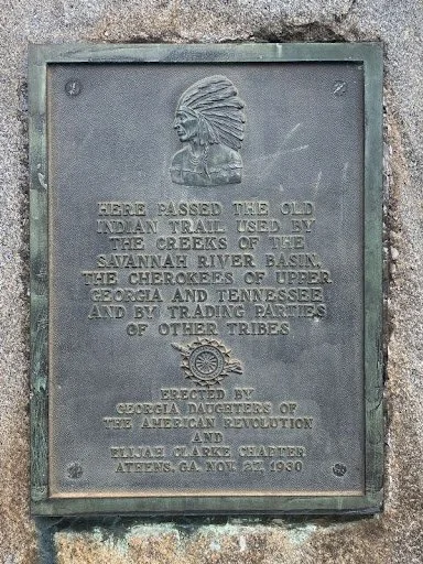 This marker was placed on S Lumpkin Street in 1930, erected by the Daughters of the American Revolution. The plaque features a silhouette of a person in a feather headdress with an inscription below. The inscription reads “Here passed the old Indian trail used by the Creeks of the Savannah River Basin, the Cherokees of Upper Georgia and Tennessee, and by trading parties of other tribes.” While this marker acknowledges indigenous presence in the area, it does not address the full truth. The land the city of Athens and the University of Georgia rests on was originally indigenous land, home to the Muscogee and Cherokee nations. However, this marker makes no reference to indigenous possession of this land. The inscription recognizes a far-off indigenous presence while also negating their land rights. Additionally, the inclusion of the feather headdress on the marker perpetuates an inaccurate, stereotyped image of native people. Despite what some may think, feather headdresses are not included in the ceremonial regalia of all Native American tribes. For example, neither the Muscogee nor the Cherokee traditionally wear feather headdresses of this sort.