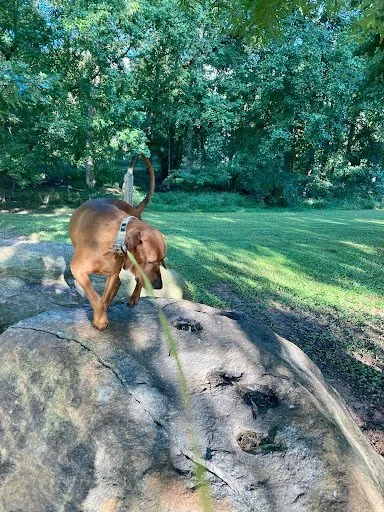 Located in North Athens, Dudley Park is a 31-acre park set along Trail Creek and the North Oconee River. Although the park was established in 1953, the territory was in use long before that. At Dudley Park, one can still find remnants of an indigenous past in the form of bedrock mortars. In the Archaic era (6000 B.C. - 750 A.D.), native people used rocks along rivers to grind beans, nuts, and other plant seeds into pastes and food. To crush the seeds, natives used a tool equal to a modern-day pestle to push the seeds into the rock. As a result of this repetitive pressure, circular indentations in the rocks formed. These indentations are called bedrock mortars. As seen here, the mortars can be different sizes and have different depths depending on the force used to grind the nuts and the amount of time nuts were repeatedly ground in this spot. The appearance of these depressions indicates a long history of indigenous habitation in the surrounding area.